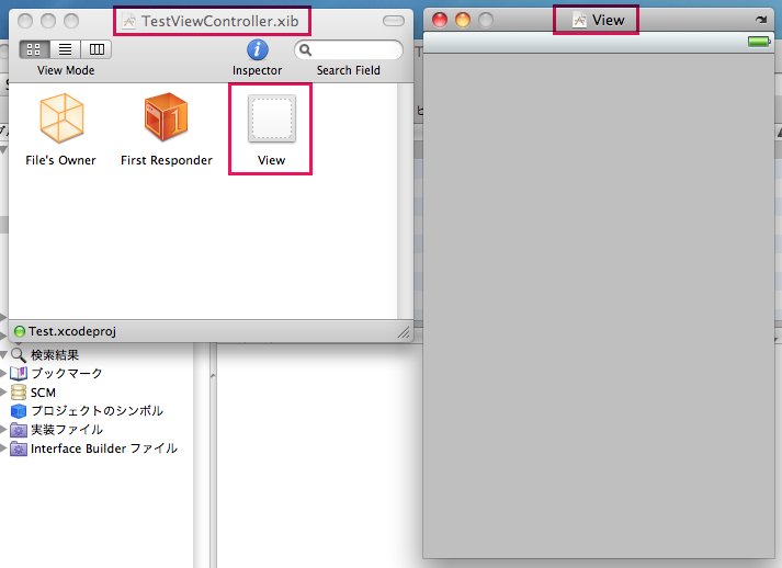 「TestViewController.xib」が出てきて、iphoneの画面である「View」が出ます。「View」が出ない場合は「TestViewController.xib」の「View」というアイコンをダブルクリックしてください。