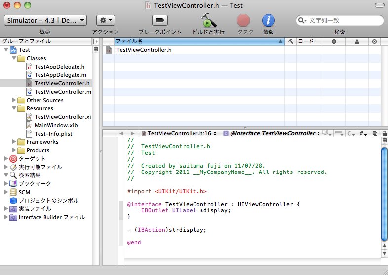 まずは「Classes」フォルダの「TestViewController.h」の中で、ラベルのアウトレットとアクション発生時に呼ばれる関数を定義します。
