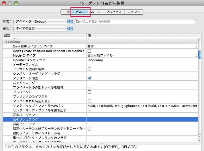 こんなダイアログが出ますので、タグを「ビルド」にして下にスクロールすると「他のリンカフラグ」という項目がありますので、空欄をダブルクリックします。