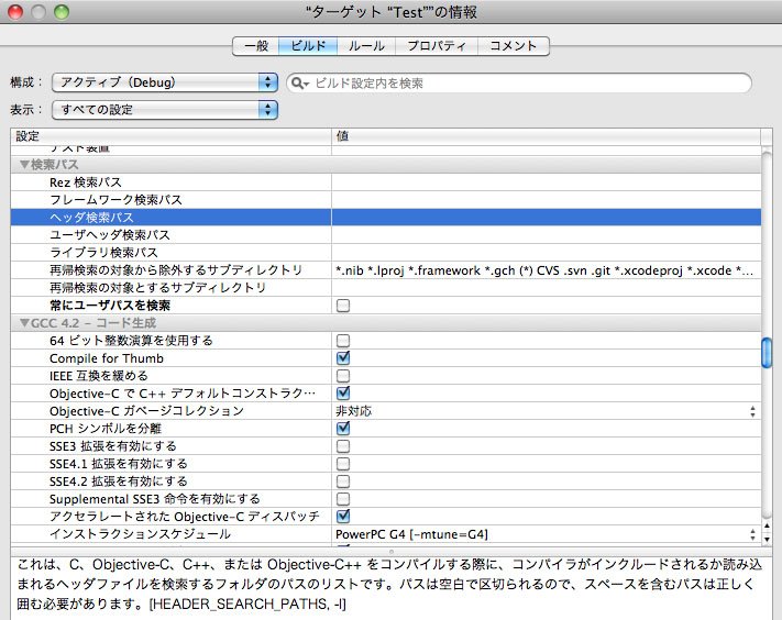 さらに下にスクロールすると「ヘッダ検索パス」という項目があるので、同様の手順で「/usr/include/libxml2」を設定します。