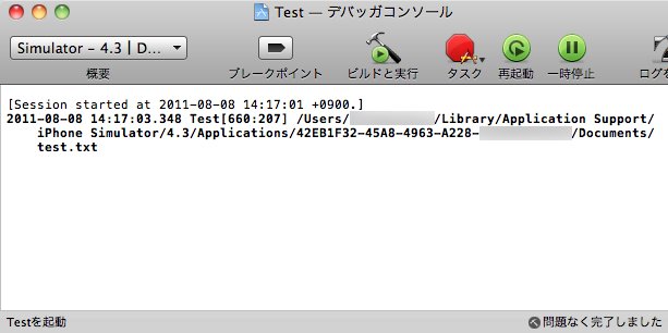 NSString *homeDir; NSString *docDir; NSString *filePath; NSString *str; //Homeディレクトリのパス取得 homeDir=NSHomeDirectory(); //Documentsディレクトリのパス作成 docDir=[homeDir stringByAppendingPathComponent:@"Documents"]; //ファイルのパス作成 filePath=[docDir stringByAppendingPathComponent:@"test.txt"]; //ファイルのパスを表示 NSLog(filePath); //ファイルへの書き込み str=@"test¥ntest¥ntest"; //testを3行書く [str writeToFile:filePath atomically:YES];