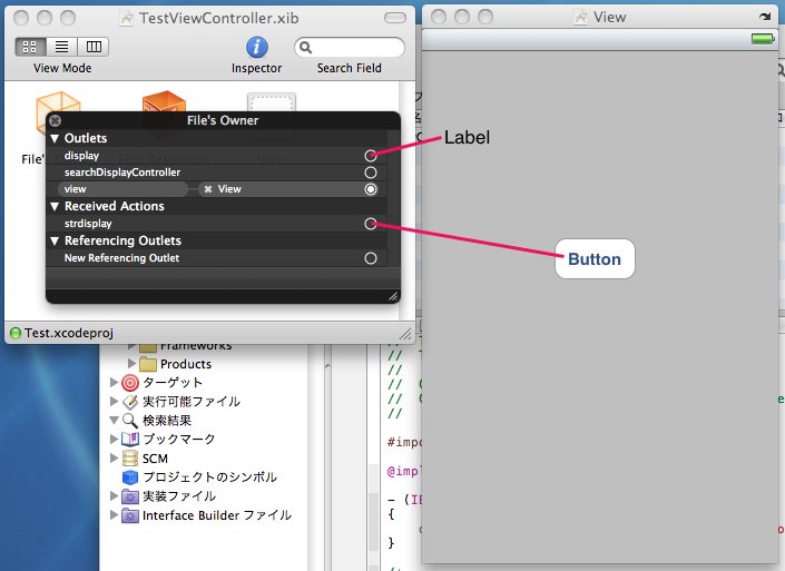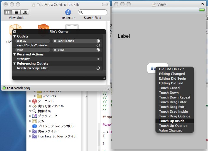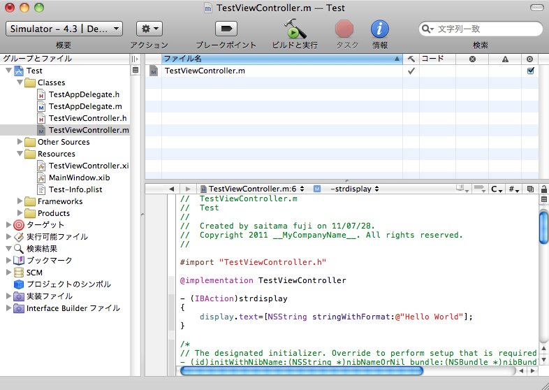 「TestViewController.m」の中で、「strdisplay」発生時の動作を書きます。