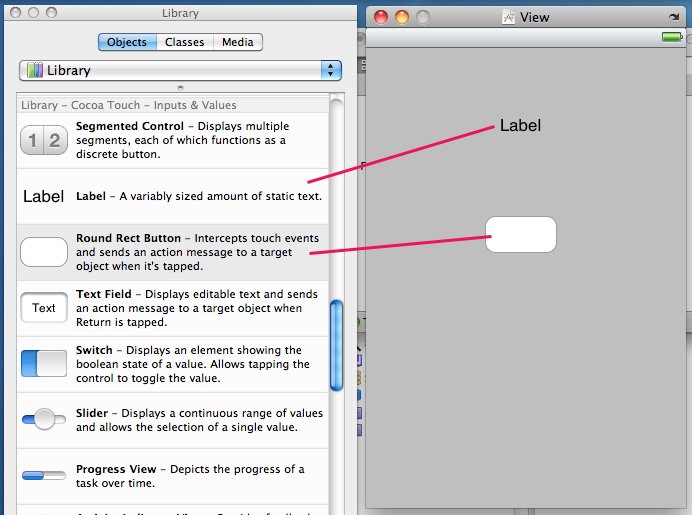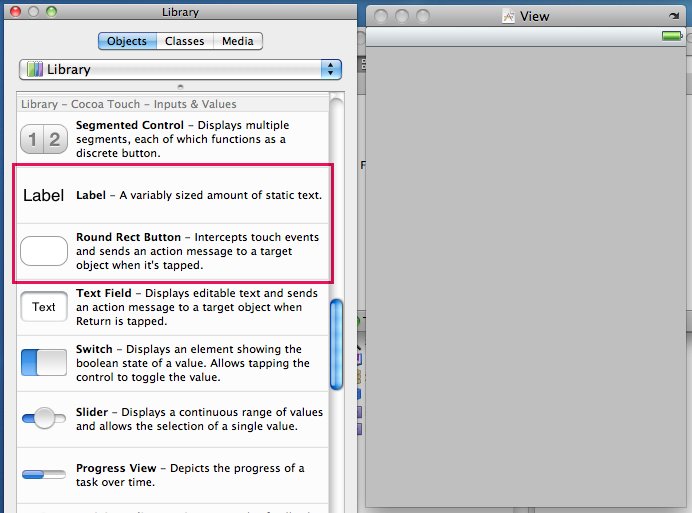 「Library」で上の「Objects」ボタンをクリックして、下にスクロールすると「Library - Cocoa Touch - Inputs & Values」という項目に「Label」と「Round Rect Button」があります。