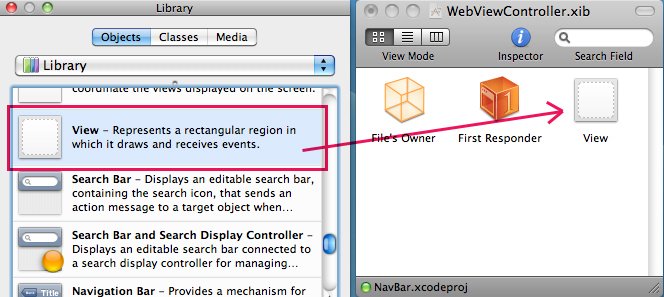 新しく作った「WebViewController.xib」を開き、「Library」から「View」をドラッグ&ドロップしてください。